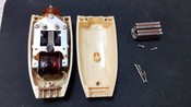 A szerkezet nem komplett, valamilyen elektronikát tartalmazó fém tokozat és az egészet befogadó (fa) doboz hiányzik.