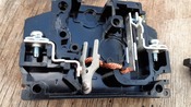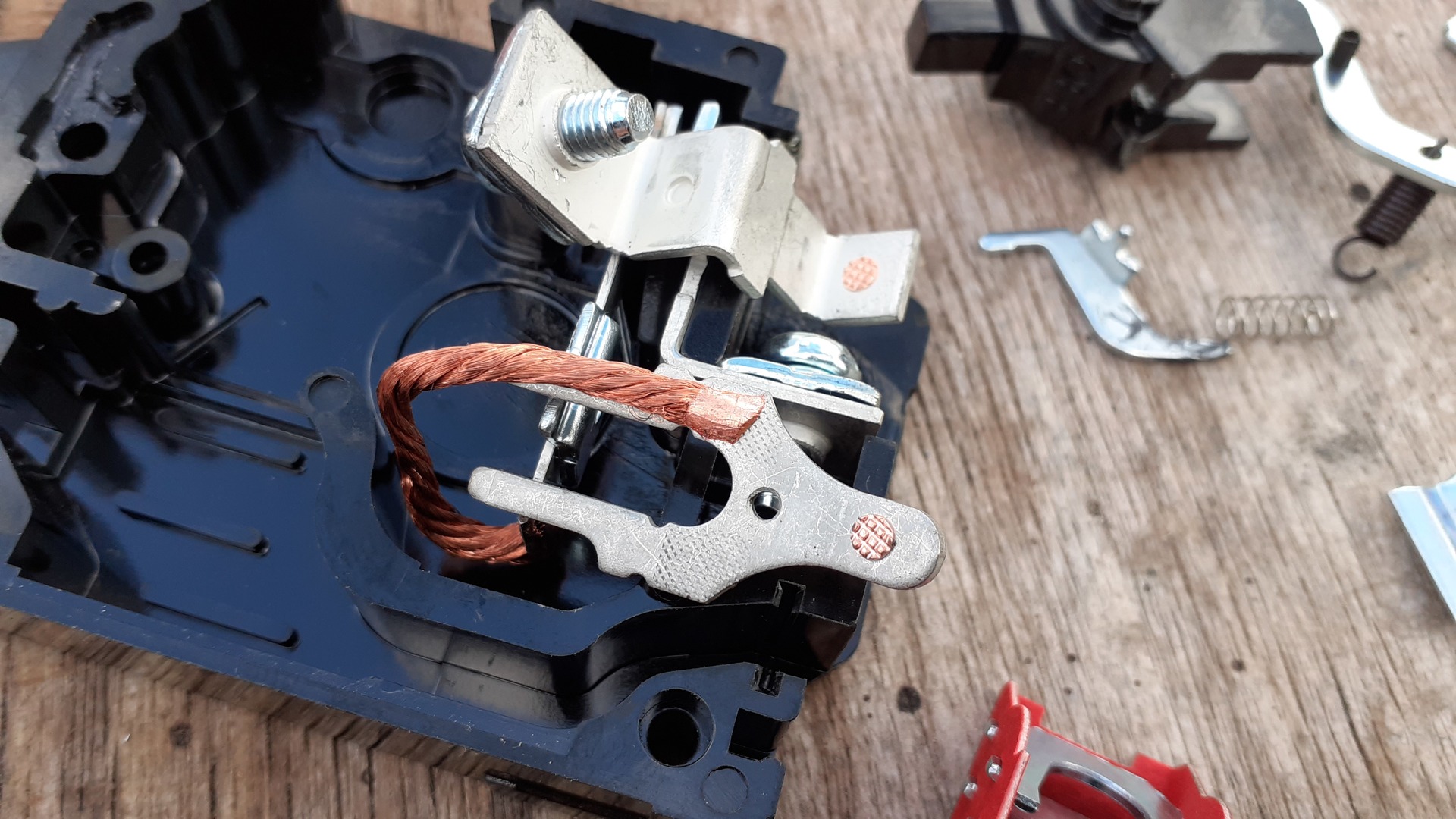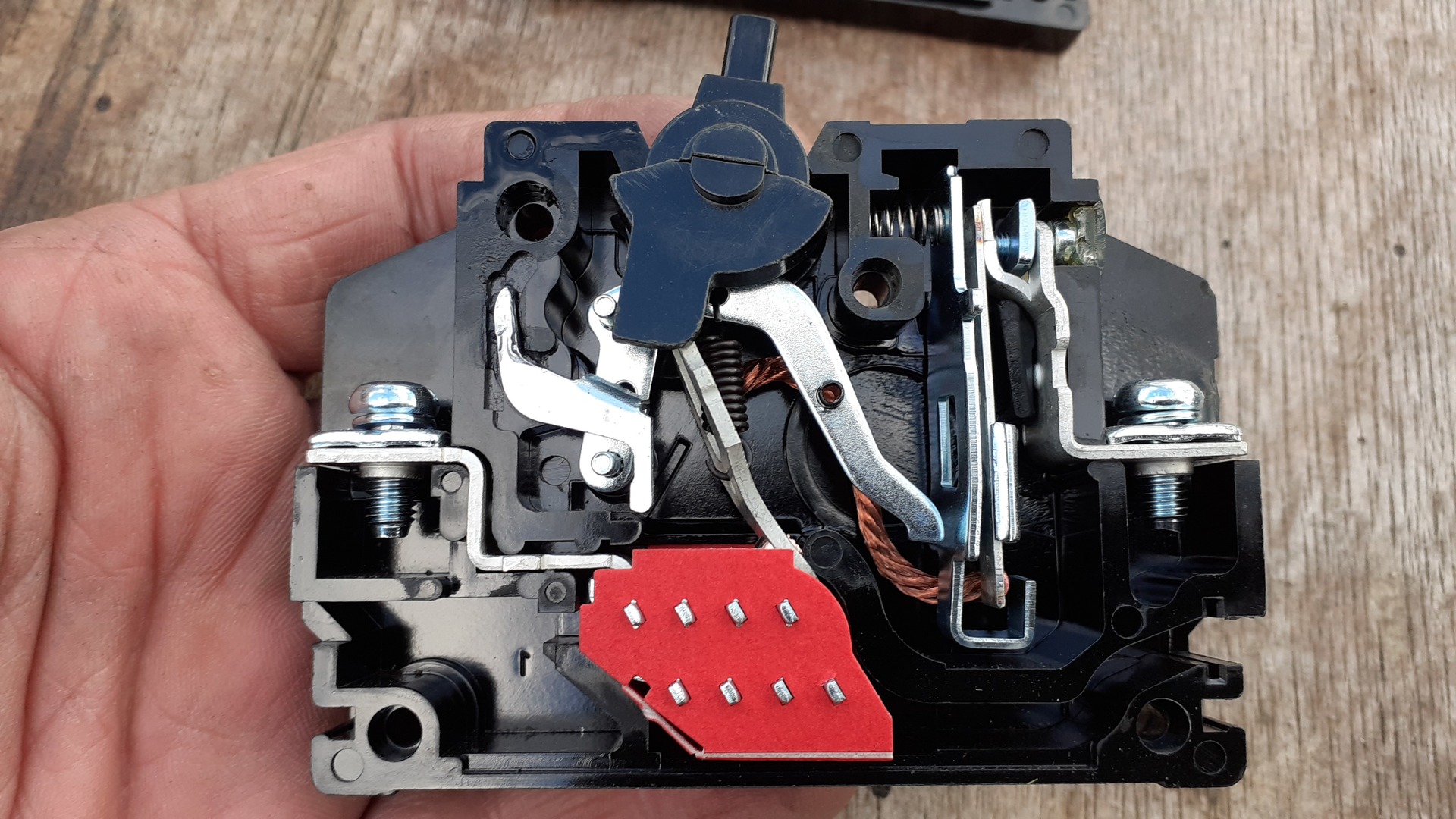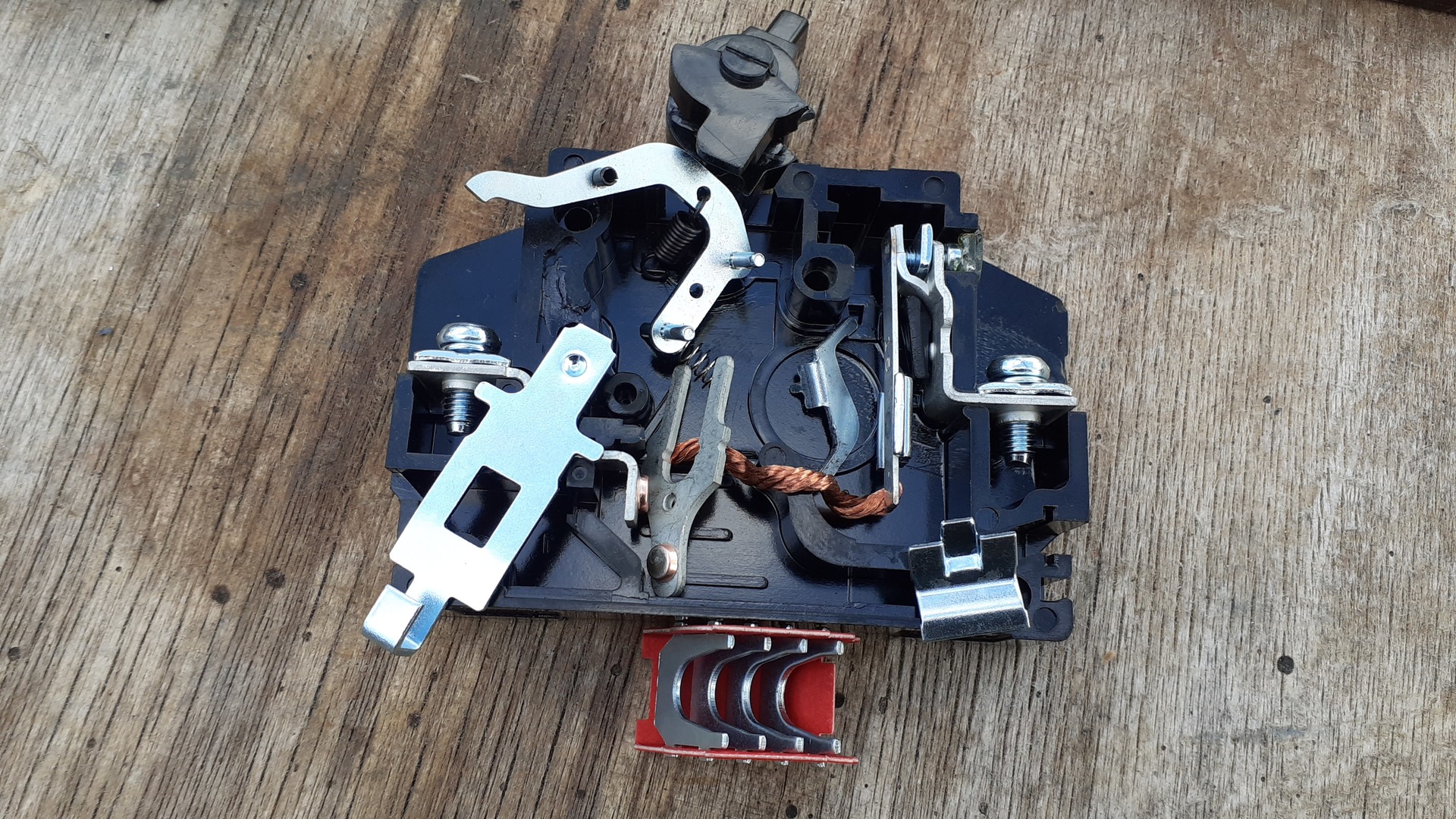A napjainkban gyártott MCB-k csak abban térnek el ettől, hogy a termikus kioldó részegység mellett egy mágneses kioldó is van bennük. A piros bizbasz az ívoltó, viszonylag kis méretéből arra merek következtetni, hogy ez 200V feszültségre termett.