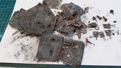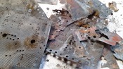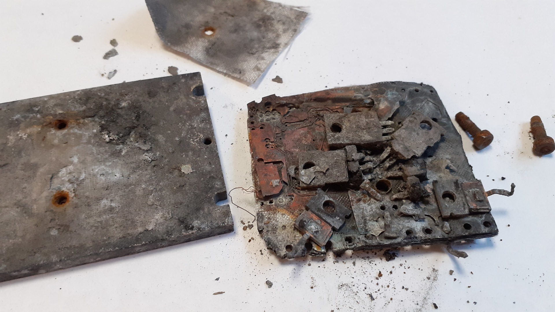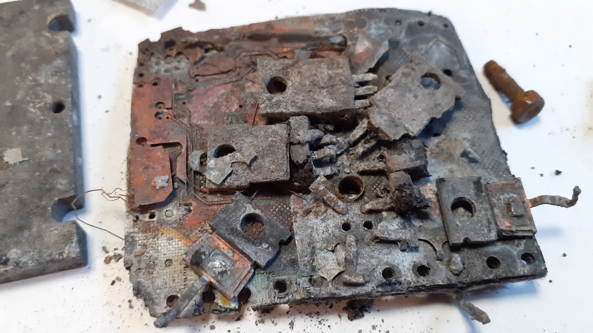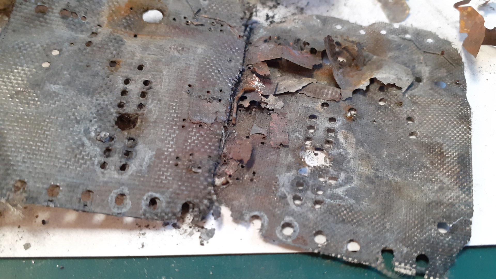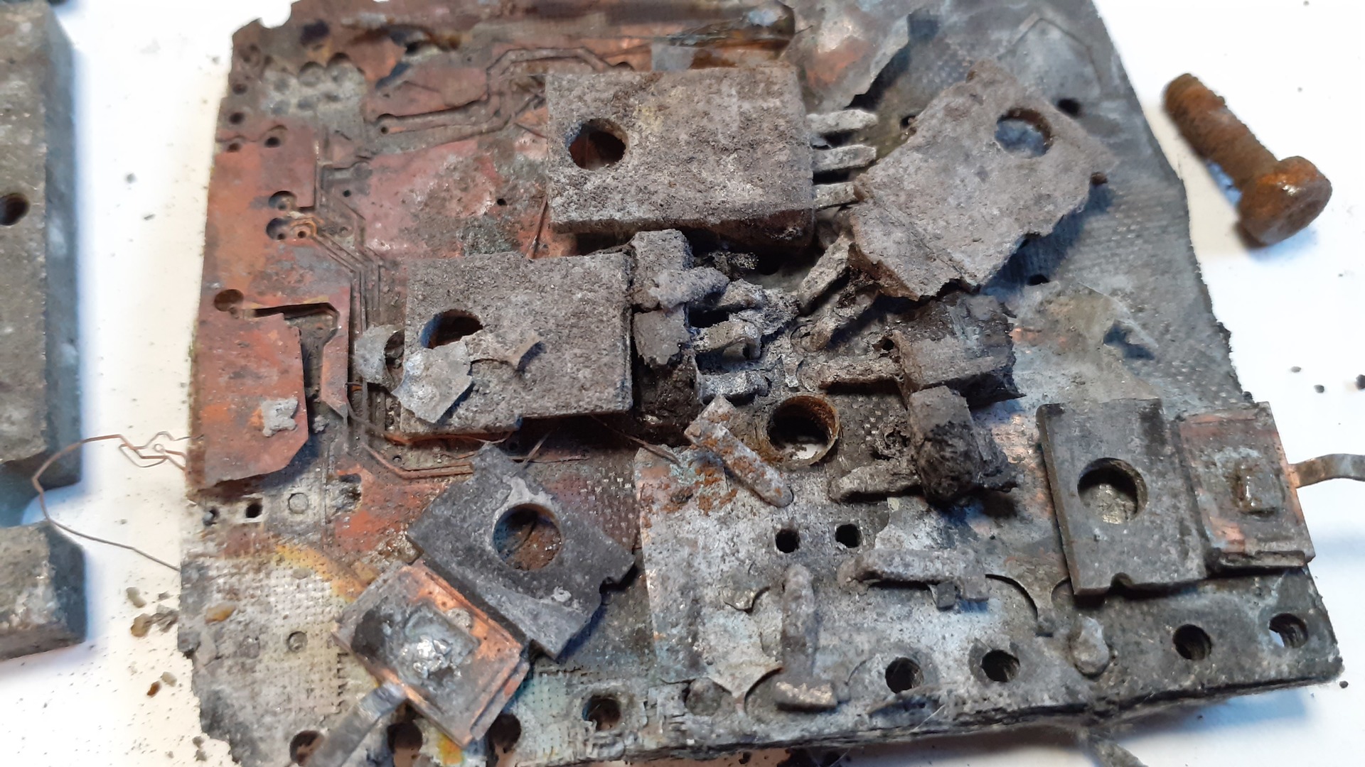 A vékonyabb réz vezetősávok, csak itt-ott maradtak meg az üvegszál rétegek között.
