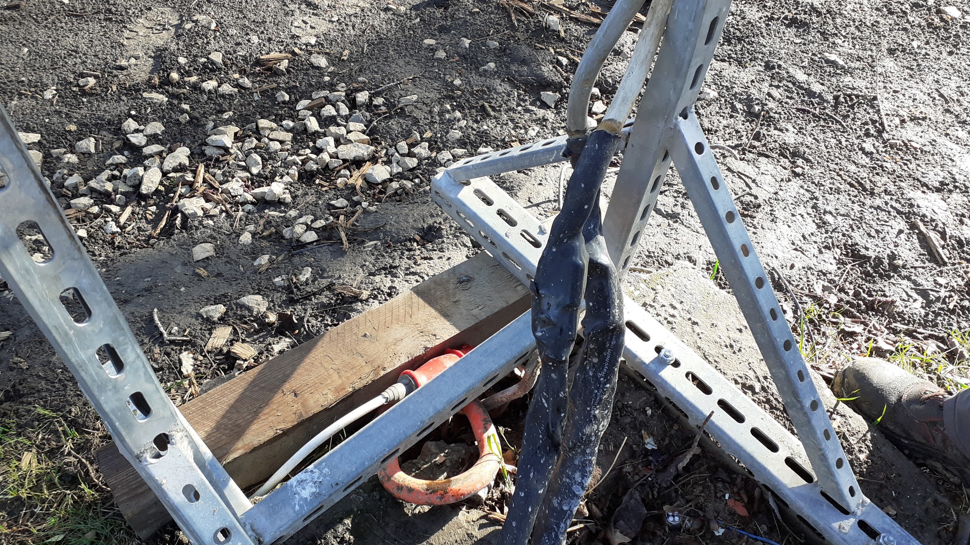 A földből kiálló, vastag -minden bizonnyal valamilyen régi alu- földkábelek, ISLY 5x10 és MT 5x6 kábellel, zsugorcsöves kötéssel toldva, hogy beérjenek a fölé épített lábakon álló lemezszekrénybe.